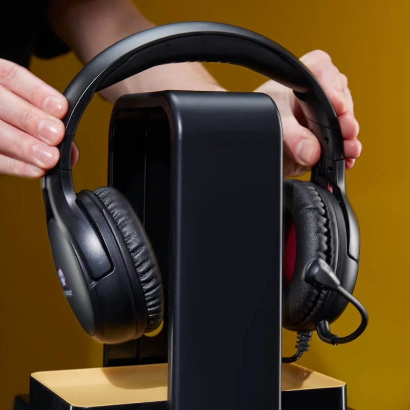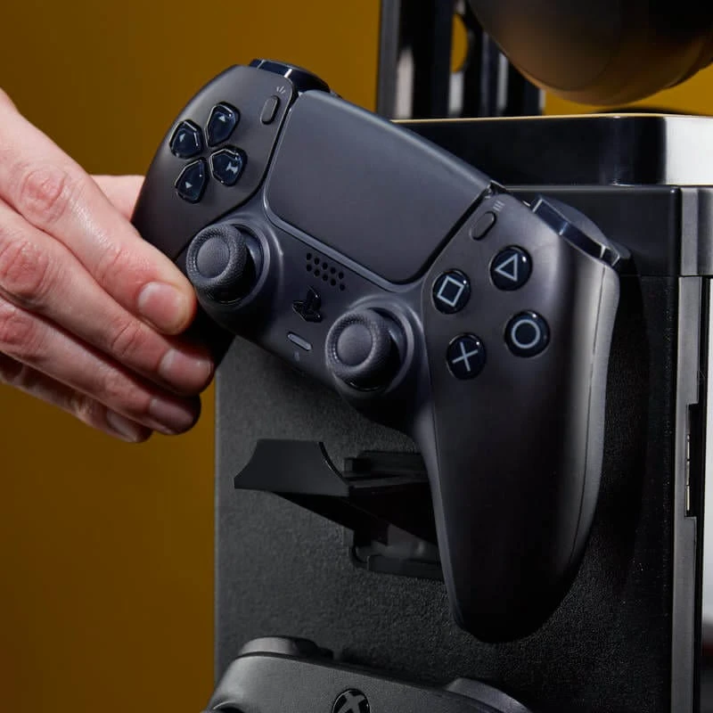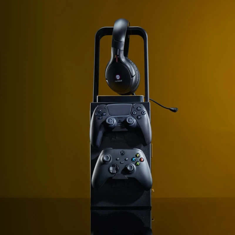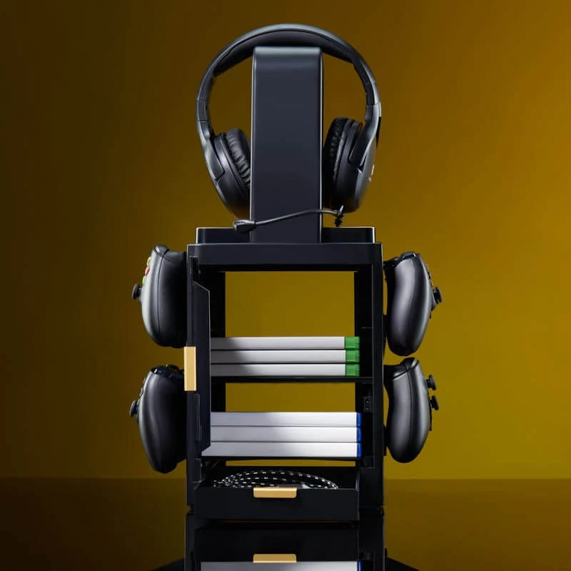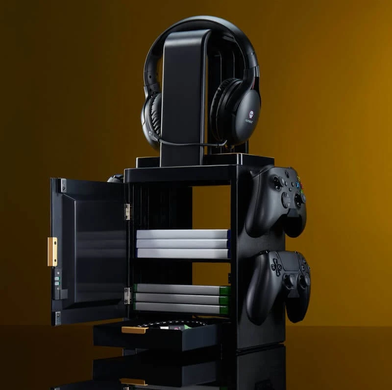 This smart, contemporary storage solution also features dedicated headphone and controller mounts, storage space inside for up to 10 games, an integrated tray for mobile devices, and a drawer for cables and accessories.Β