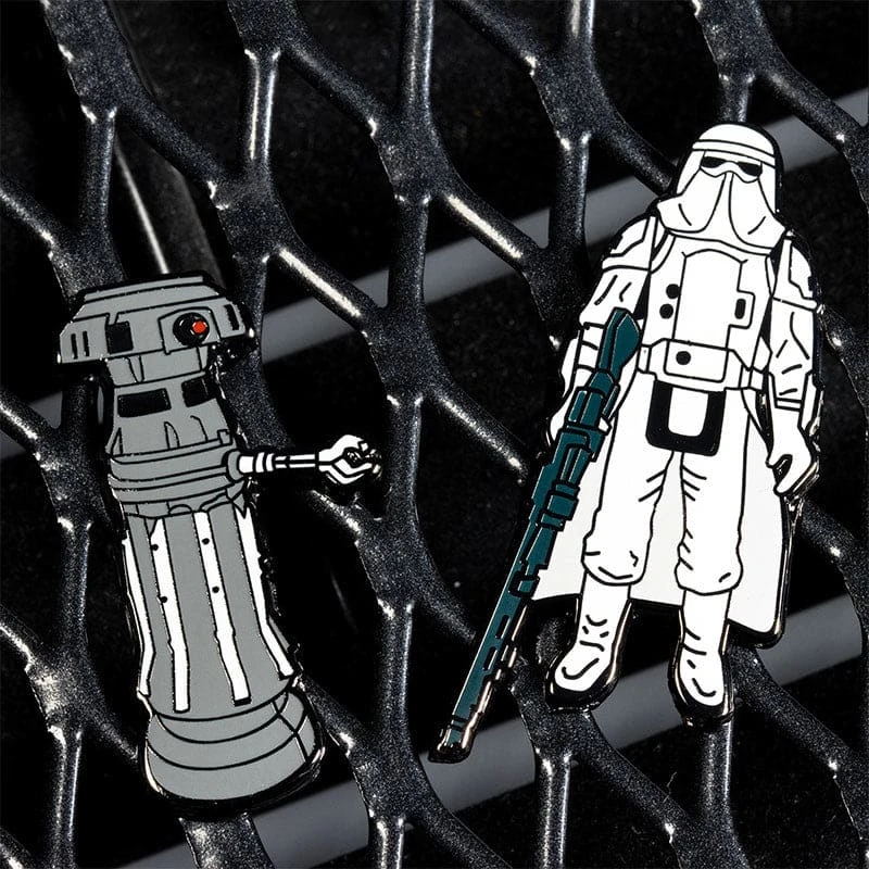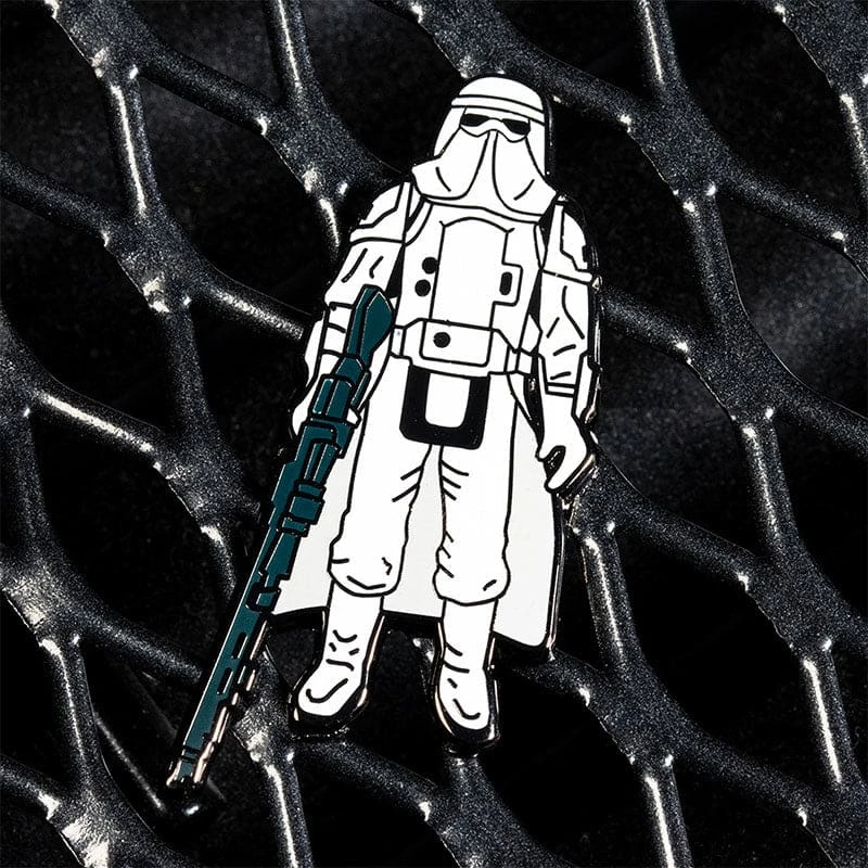 - Two premium quality hard enamel metal pins with a glossy finish featuring FX-7 and Imperial Stormtrooper (Hoth Battle Gear) on a backing card.